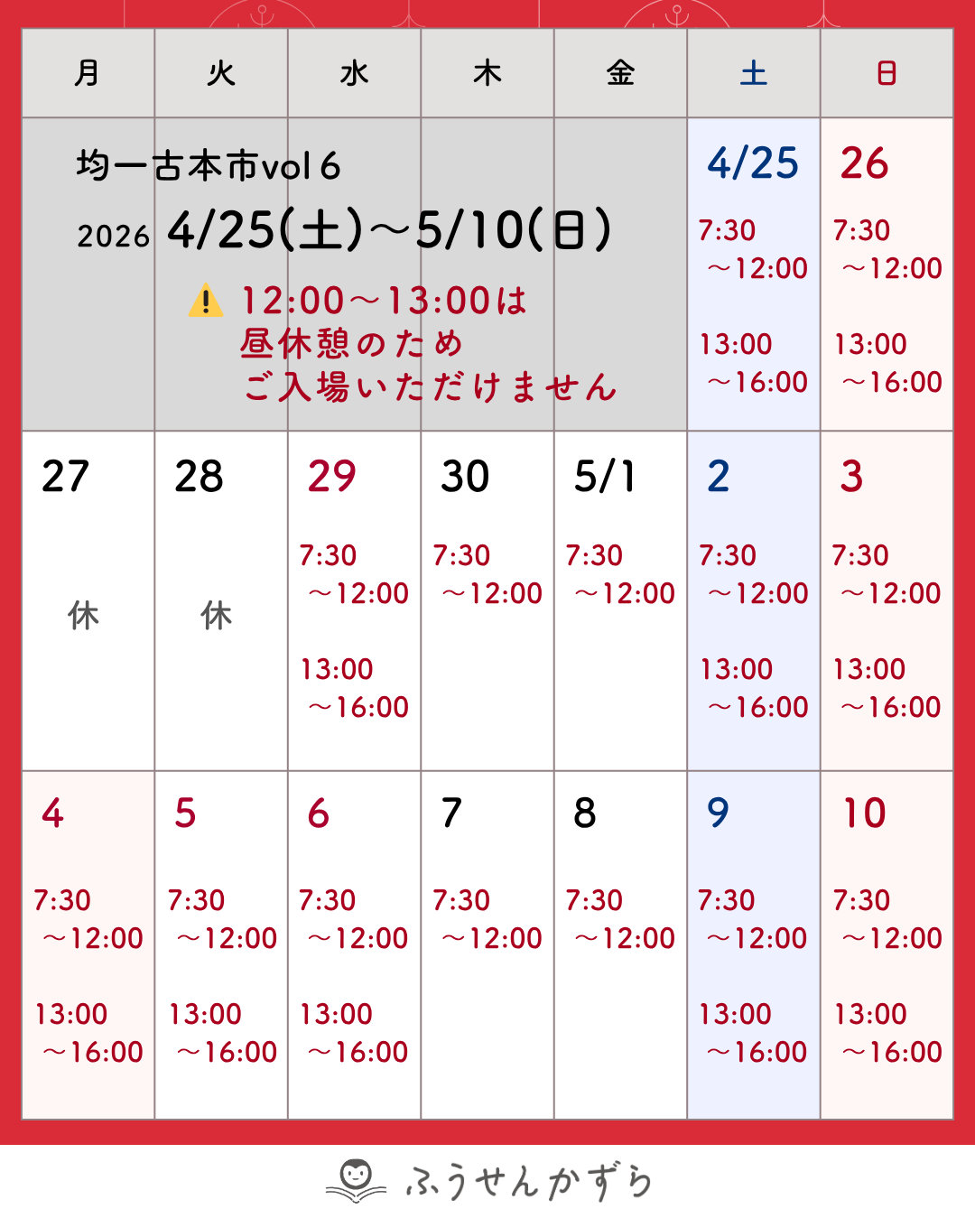 100円・300円・500円の均一古本市の開催時間をご案内いたします。