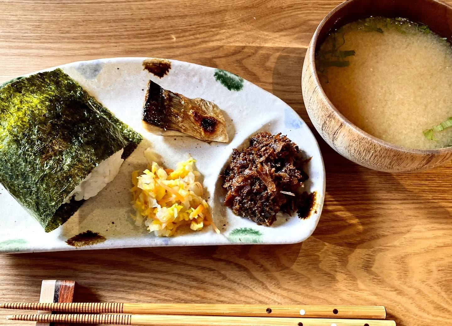 ゆるく結んだふわふわのおむすびと出汁のきいたお味噌汁。